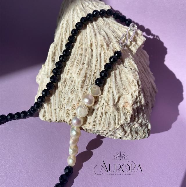 Wunderschöne handgefertigte Statement Kette aus facettierten Onyx Perlen (6mm) & Süßwasser Zuchtperlen in weiß-Creme.