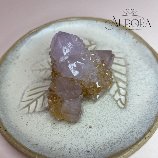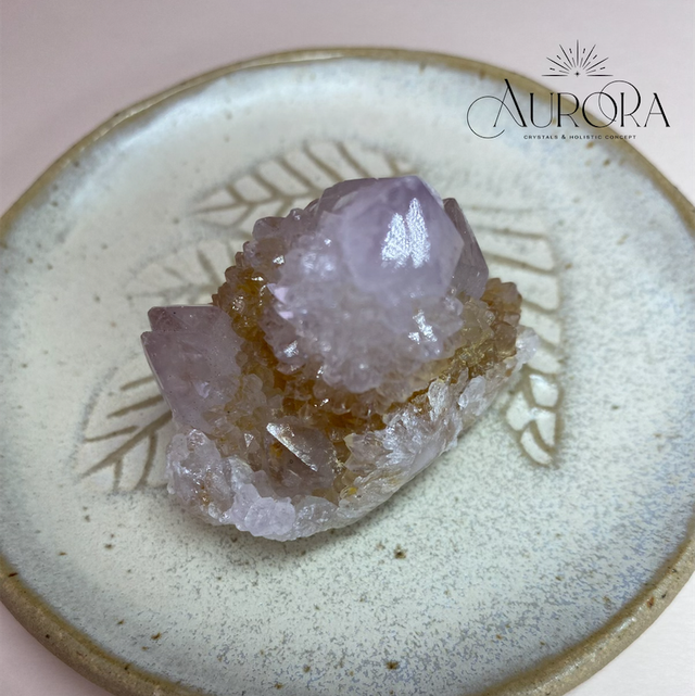 Aus der Wüste Südafrikas stammt der stachelte Kaktus-Quarz, der aufgrund seiner besonderen energetischen Eigenschaften auch Spirit Quarz genannt wird. Typisch sind die zarten Lavendelfarben und die vielen kleinen Amethyst-Kristalle, die als "zweite Generation" auf einem oder mehreren größeren Kristall gewachsen sind.